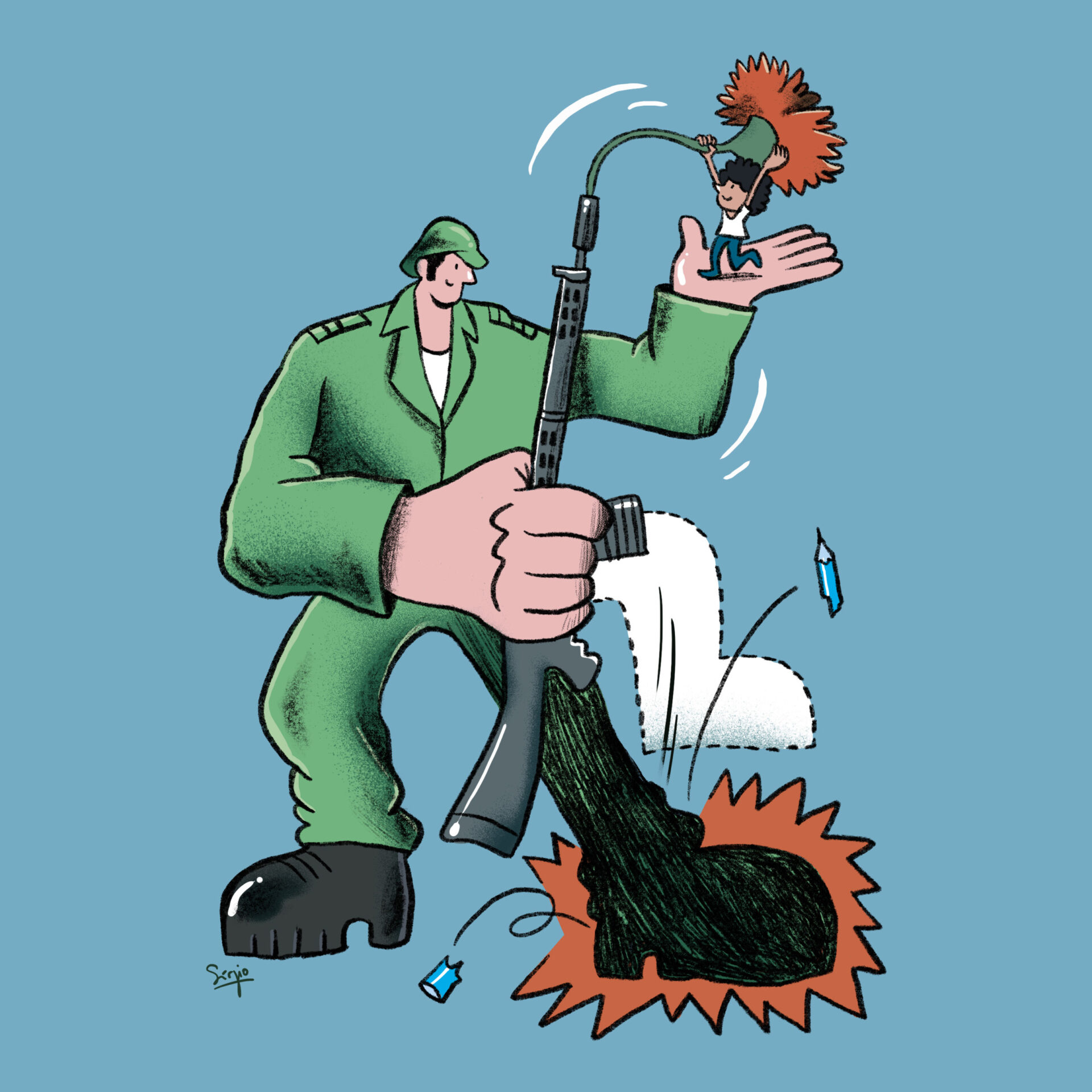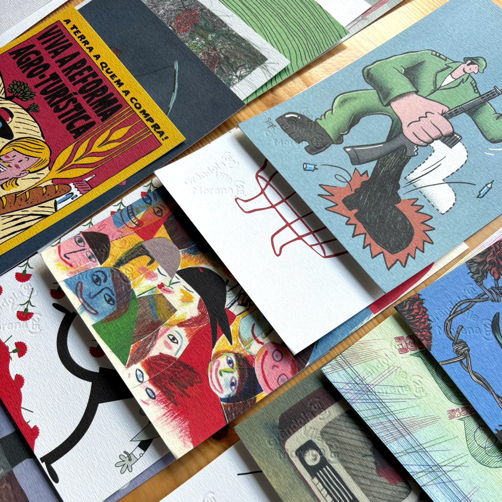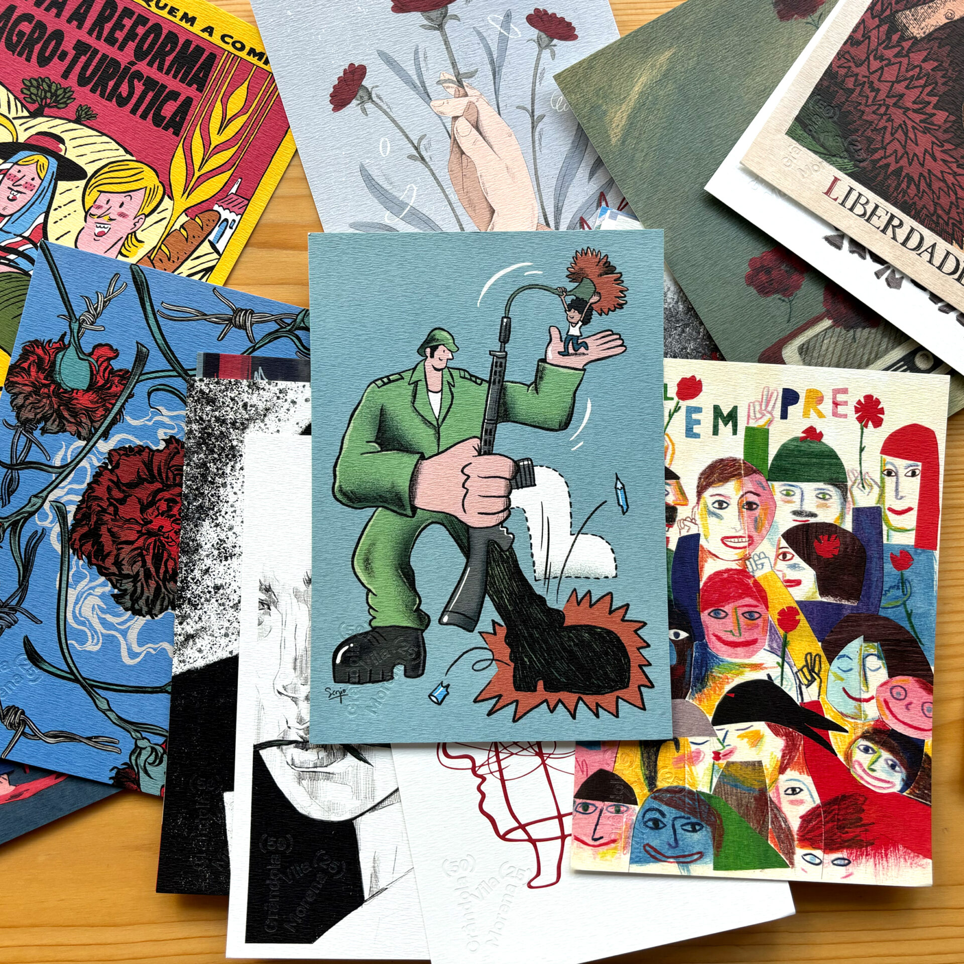 Ilustração criada a convite da Câmara Municipal de Grândola, para a coleção de postais ilustrados intitulada "o dia inicial" (que conta com o contributo de 25 ilustradores e 25 escritores), para a celebração dos 50 anos do 25 de abril.