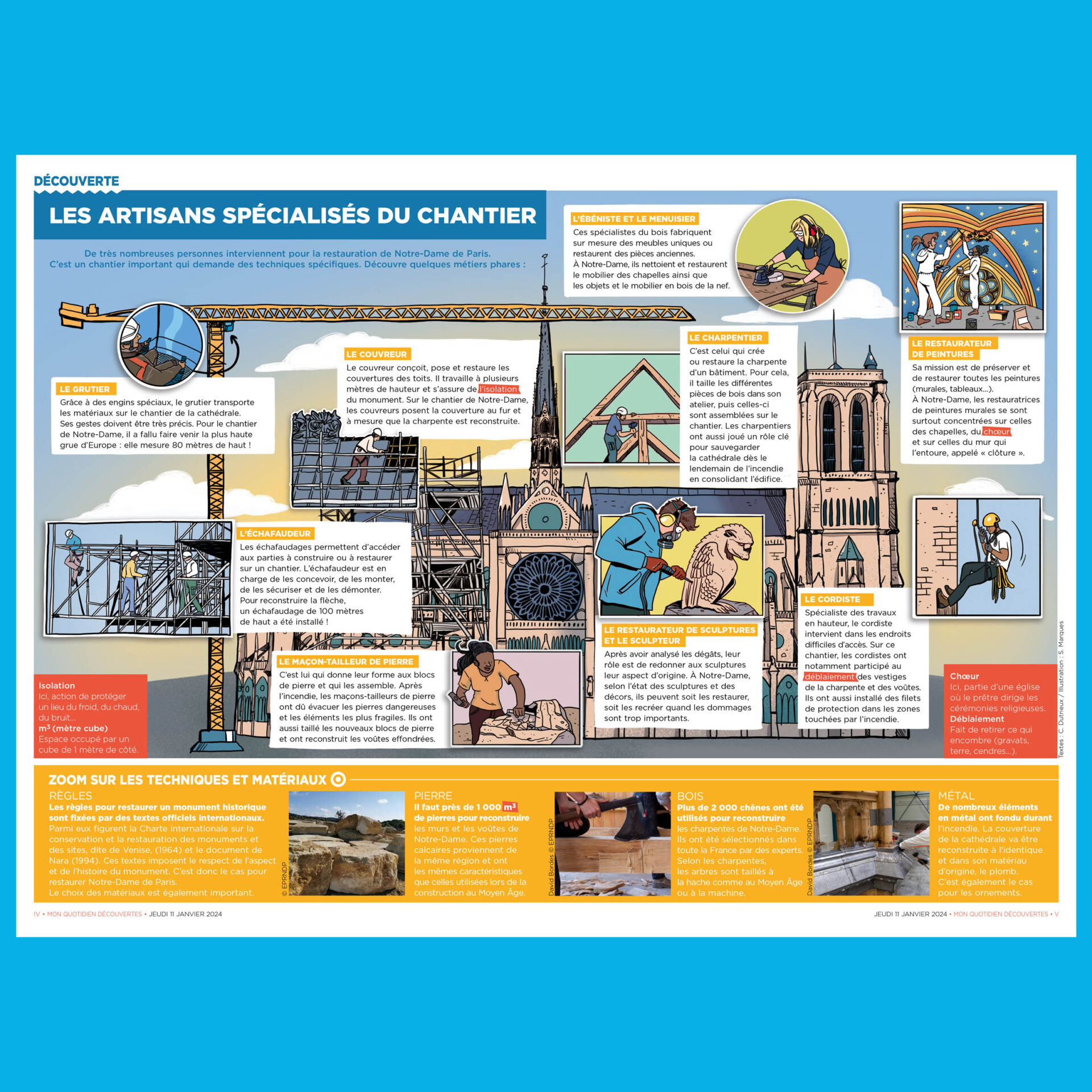 I created these two infographics for the children's newspaper “Mon Quotidien” (France) about the reconstruction of the “Notre-Dame de Paris” Cathedral and which succinctly explains all the steps that were necessary to recover the damage suffered from the terrible fire of 2019 . I loved being able to participate in the creation of another edition of this newspaper, and especially because it is such a special and interesting topic as this one. Hope you like it! 🙂