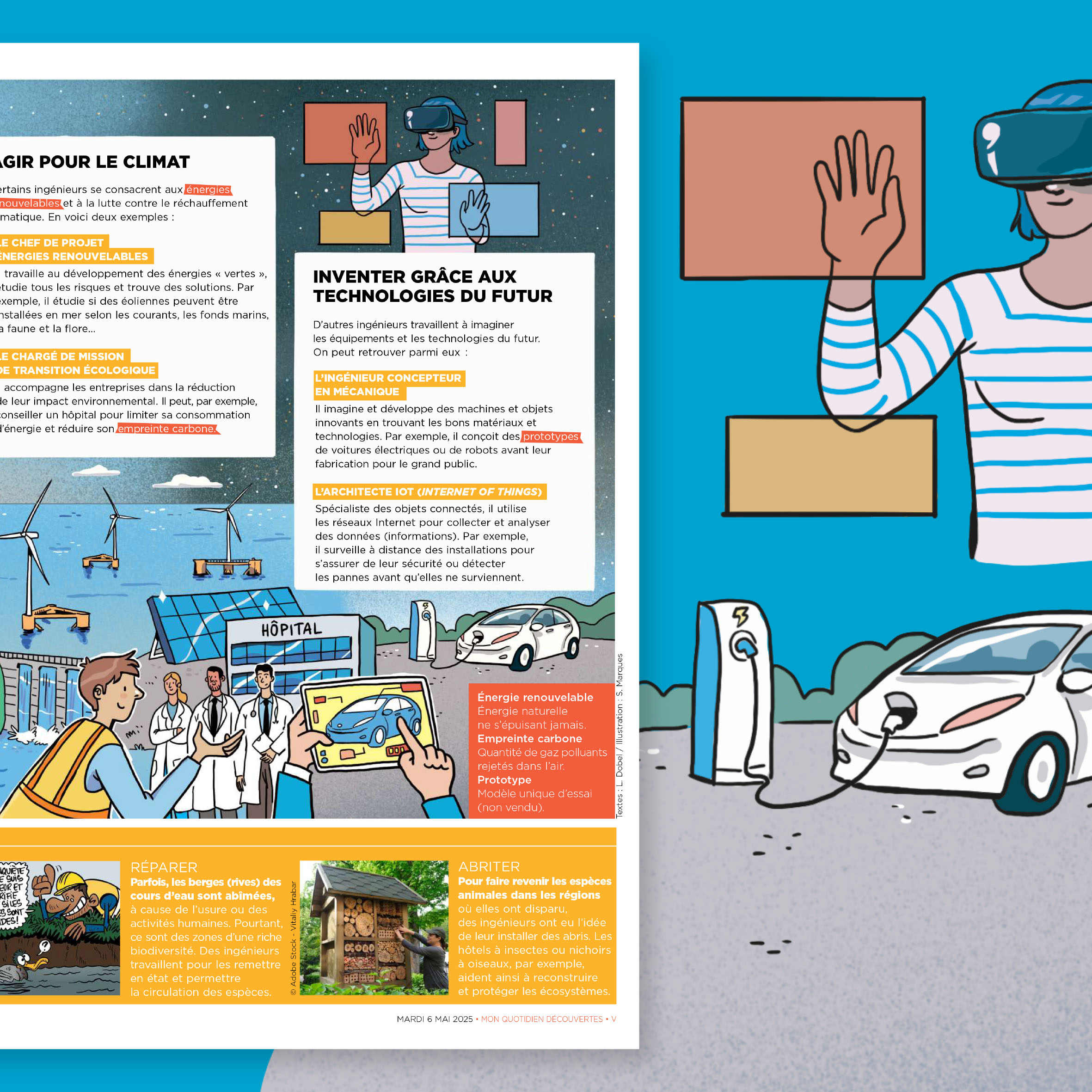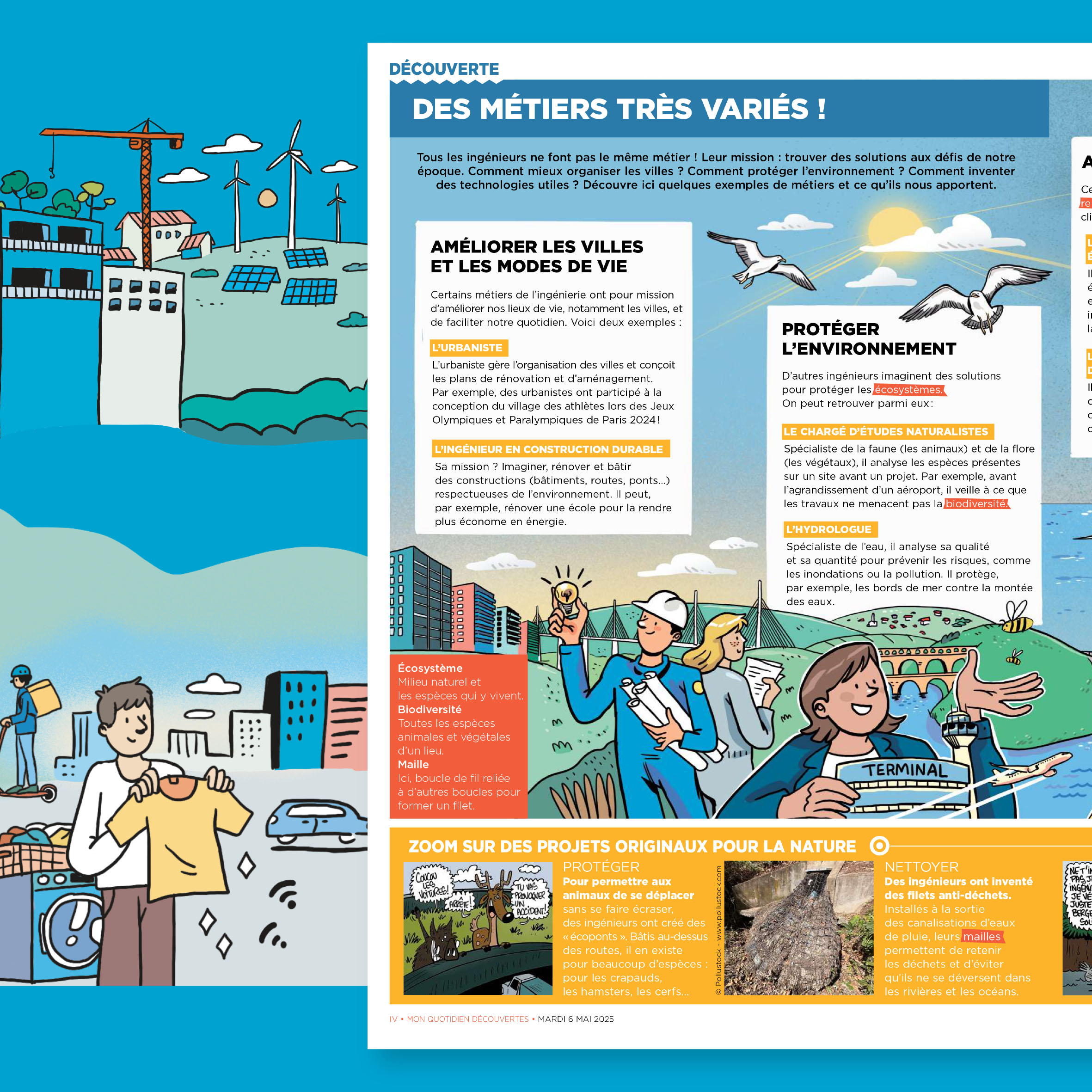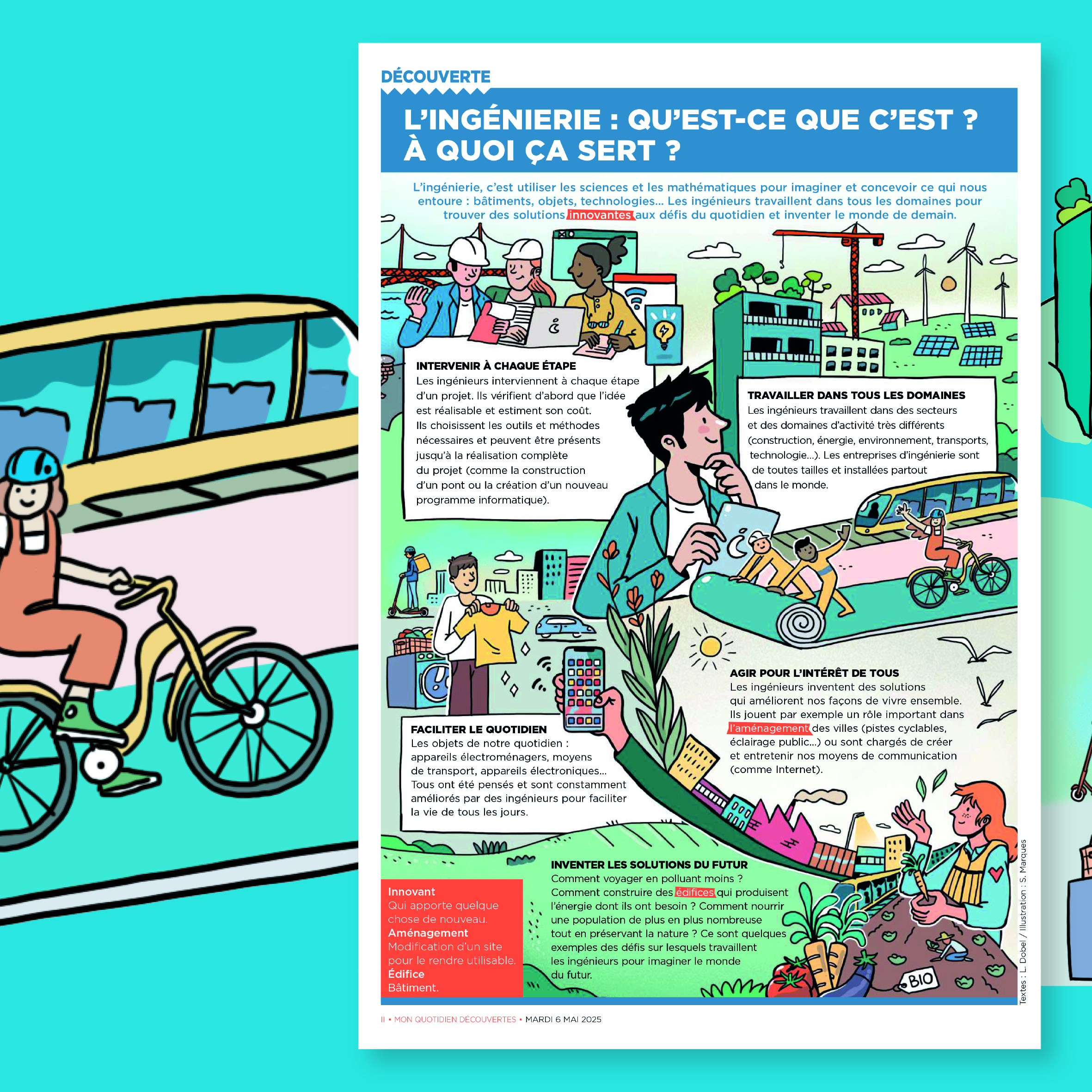 ✍️ Tive novamente a oportunidade de participar numa edição especial do Mon Quotidien com duas infografias sobre a profissão de engenheiro, que convida os jovens leitores a mergulharem no vasto universo da engenharia, explorando as suas múltiplas áreas e os desafios que os profissionais enfrentam diariamente.